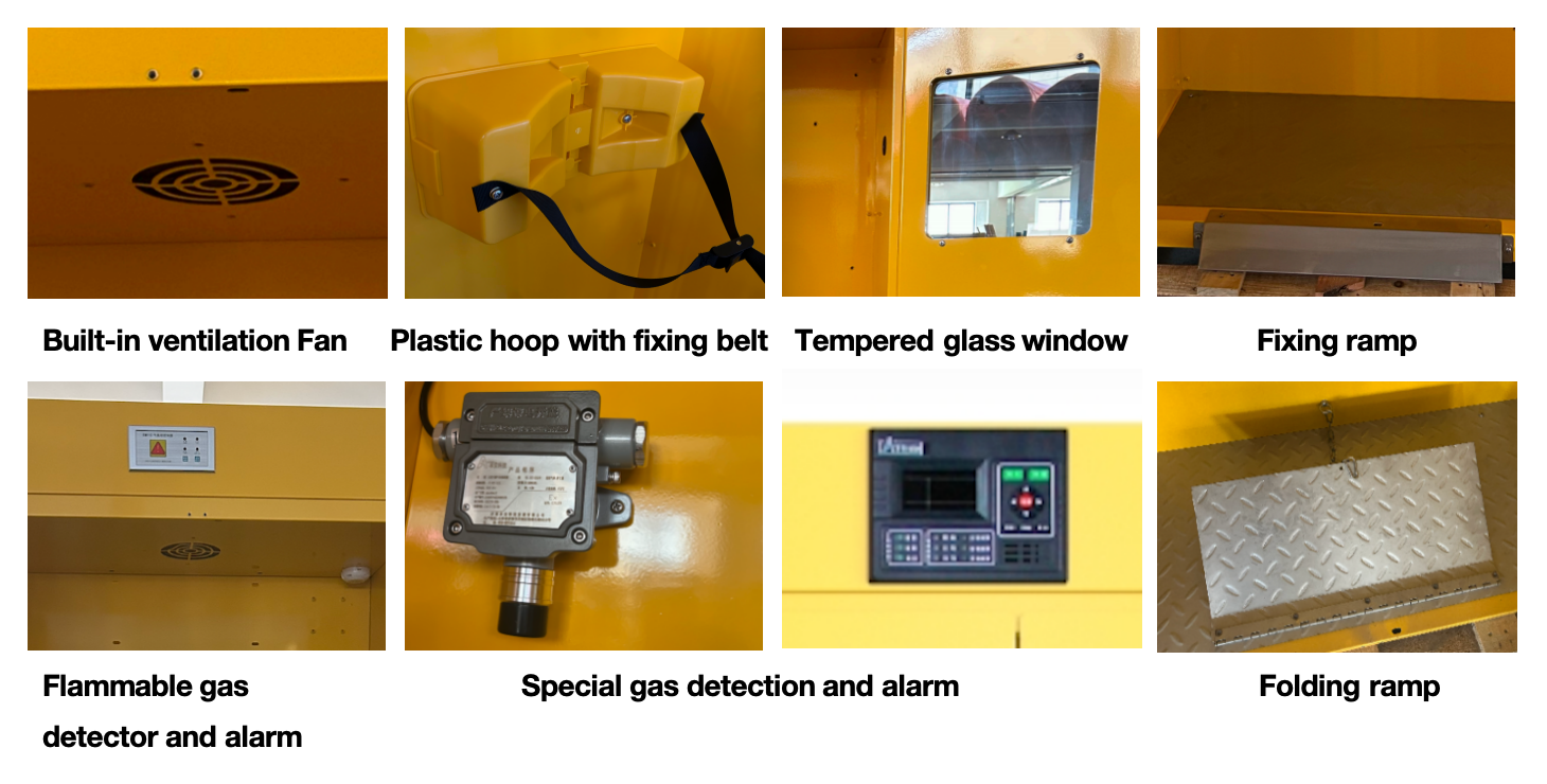 1. Exclusively used for storing dangerous combustible gas cylinders in laboratories and chemical plants, for protecting the inside gas cylinder from the outside fire and the surroundings from the internal fire if any.